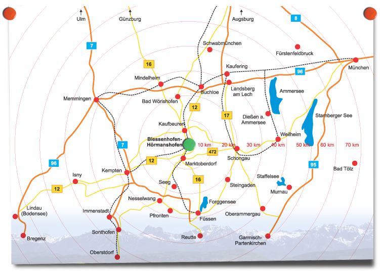 - Marktoberdorf (Kreisstadt, 22.000 Einwohner) 6 km
